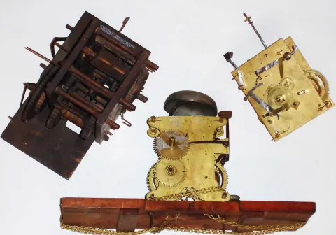 Long case Striking Clock Movements- 3 (Three): English 8 day long case 30 hour wooden works; American (?) 30-hour continuous chain, 19th century