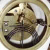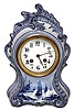 French Delft porcelain 8 day time and strike mantel clock, c1860. the front of this pristine hand painted case, with faint craquelure as expected, has "Wan Hant" lettered at the bottom, and "P" on the case back. The large porcelain dial has a small chip and hairline by the 8. The thick beveled glass is fine. The movement, stamped Vincenti Medaille D'Argent 1855, has a matching number pendulum, appears recently cleaned, and ticks and strikes. Ht 11"