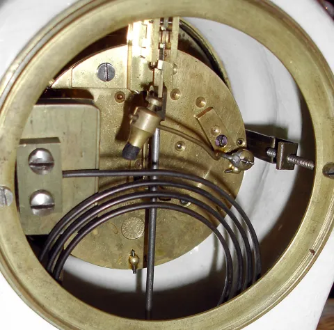 the front of this pristine hand painted case, with faint craquelure as expected, has "Wan Hant" lettered at the bottom, and "P" on the case back. The large porcelain dial has a small chip and hairline by the 8. The thick beveled glass is fine. The movement, stamped Vincenti Medaille D'Argent 1855, has a matching number pendulum, appears recently cleaned, and ticks and strikes. Ht 11"