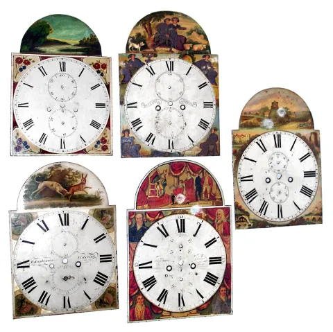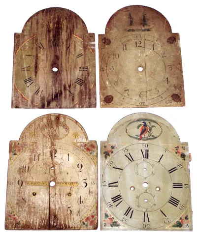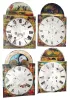 Tall case dials- 13 arch top: 4 are wood, 9 are painted iron, 1 has moon dial, all from first half 19th century colorful faces in various conditions but most usable for clocks or alone as folk art artifacts. Iron dials are probably all English; wood most likely Connecticut. 5 have maker names and places. English ones all date c. 1835-1865 and Conn. ones c. 1805-1825.