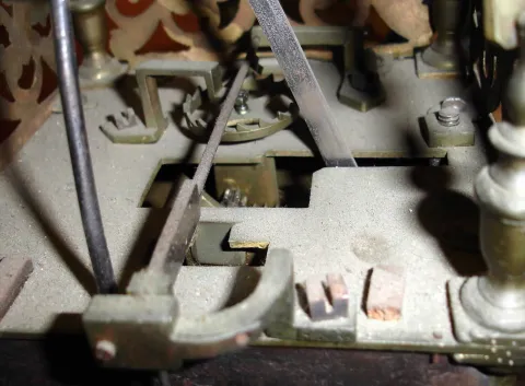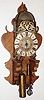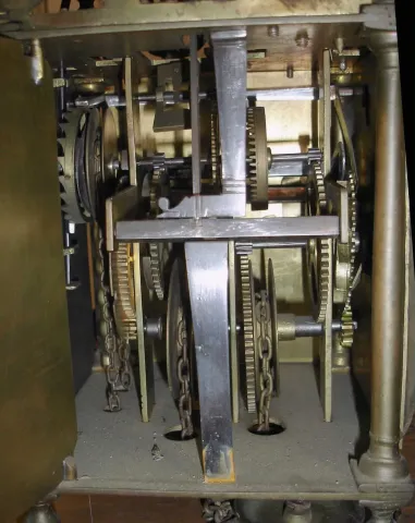 this is a large, heavy and impressive clock that looks older than it is. The continuous chain and single weight drives both trains, and the alarm has its own chain and small weight. The movement, with crown wheel escapement and rear cow tail pendulum, needs service. The wall bracket is thick wood appropriately shaped. Movement ht 14.5", bracket ht 26"