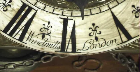 Lantern Clock, Windmills, London, reproduction 30 hour time, strike and alarm weight-driven one-hand wall clock with wood bracket