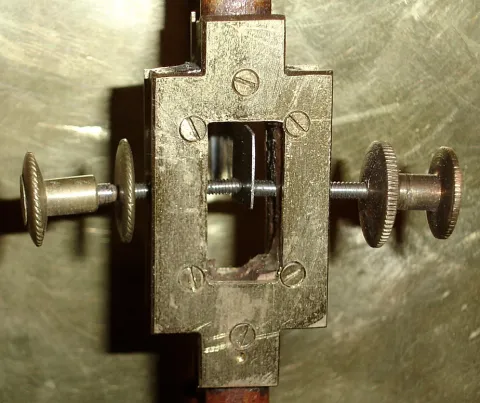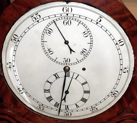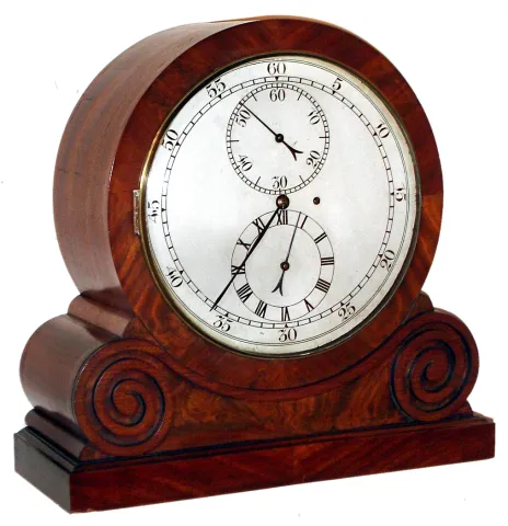 English bracket clock with astronomical dial, 8 day, time only, spring driven fusee movement, with Graham's dead beat escapement and maintaining power, in a mahogany veneer case with painted metal dial. There is an unusual beat adjustment mechanism on