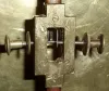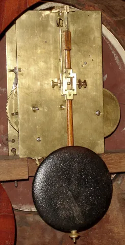 the case retains its original finish with very minor veneer flake on lower left base. The iron pendulum bob is a replacement. Ht 19"