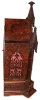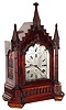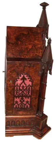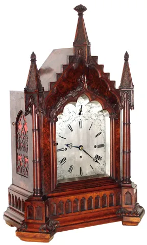 English, (for Scottish market) 8 day, triple fusee bracket clock, Gothic in style, chiming the quarters on 8 bells, and striking the hours on a large coiled cathedral gong, c1875 Burl walnut and walnut case in very nice condition. Small veneer chip on the left side, a little piece of the tip on the bottom drop on the right spire and a repair to the left drop of the top spire. Lock on the back access door is missing. Original unsigned engraved silvered dial is clean with some minor scratches. Hands are original. A large and robust, heavy plated chain drive triple fusee is ticking and chiming. Note small hand in arch for Chime / Silent. Ht 27.75"