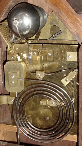 Burl walnut and walnut case in very nice condition. Small veneer chip on the left side, a little piece of the tip on the bottom drop on the right spire and a repair to the left drop of the top spire. Lock on the back access door is missing. Original unsigned engraved silvered dial is clean with some minor scratches. Hands are original. A large and robust, heavy plated chain drive triple fusee is ticking and chiming. Note small hand in arch for Chime / Silent. Ht 27.75"