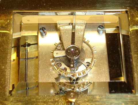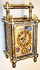 France, carriage clock in bamboo style brass case with enamel floral, butterfly, fish and avian decorations with 8 day, time, half hour strike and hour repeat, spring driven movement and similarily decorated Roman numeral dial, c1890 ticks and strikes. The case is in very good condition with no damage to the enamel. The knob pull is missing from the rear door. Ht 8" to top of handle