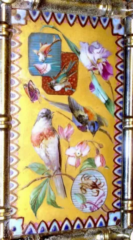 France, carriage clock in bamboo style brass case with enamel floral, butterfly, fish and avian decorations with 8 day, time, half hour strike and hour repeat, spring driven movement and similarily decorated Roman numeral dial, c1890