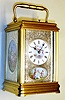 France, carriage clock in gilded brass cannelee case with multicolor painted porcelain panels each having a finely engraved silver mask, 8 day, time, half hour strike and hour repeat with Roman numeral white enamel dial, c1890