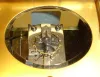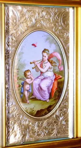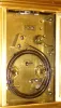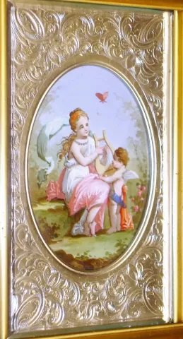 France, carriage clock in gilded brass cannelee case with multicolor painted porcelain panels each having a finely engraved silver mask, 8 day, time, half hour strike and hour repeat with Roman numeral white enamel dial, c1890 ticks but does not strike. The case and panels are in excellent condition with no damage. Ht 7" to top of dial