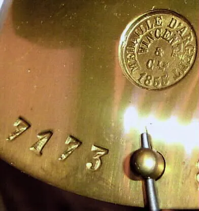 except that the scythe has become loose/separated from Chronos, clock is in overall excellent original condition. This model was made from around 1814 to about 1890, and examples can be found in several reference books, notably Elke Nieh,ser's book titled "French Bronze Clocks", page 43. Other examples can be found on the internet. The well made gong strike movement retains a perfect porcelain dial and original moon hands. In addition to the Vincenti medallion, it bears the imprint of the importer "A-1" and #7173. A very heavy item requiring special packing for shipment. Width = 21" Ht 21"