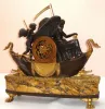 French, Love and Time, Bronze and Marble mantle clock, depicting Father time or Chronos with his scythe, sitting in a boat, steered by the cherubic Amor, and with a quality movement by Vincenti (1855 award medallion), the bronze boat and "water" mounted to a well figured piece of yellow / black striped marble, the whole supported on 4 large paw feet, c1875. except that the scythe has become loose/separated from Chronos, clock is in overall excellent original condition. This model was made from around 1814 to about 1890, and examples can be found in several reference books, notably Elke Nieh,ser's book titled "French Bronze Clocks", page 43. Other examples can be found on the internet. The well made gong strike movement retains a perfect porcelain dial and original moon hands. In addition to the Vincenti medallion, it bears the imprint of the importer "A-1" and #7173. A very heavy item requiring special packing for shipment. Width = 21" Ht 21"