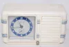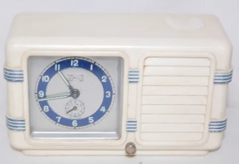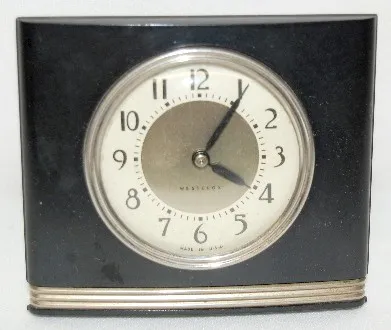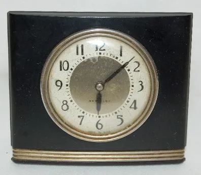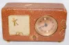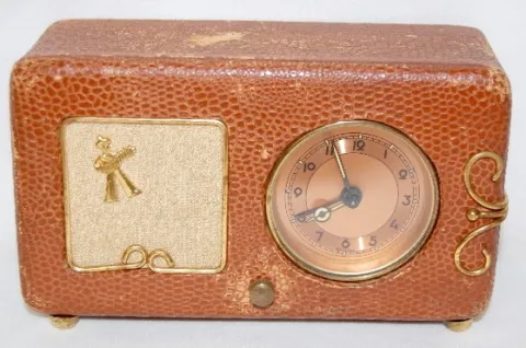 4 Small Dresser Clocks 1 & 4.) Both are Westclox La Sallita pull string dresser clocks; running at this time. 2.) Tex radio Cabinet Musci Box Clock, Swiss made; paper metallic dial with 12 hour alarm bit; running and plays at this time. 3.)Germany "Little old Lady" leatherette case music box clock; marked copper colored dial; paper tag on back; running and plays at this time. (Case wron.) Largest 3 3/4" x 6"
