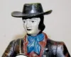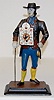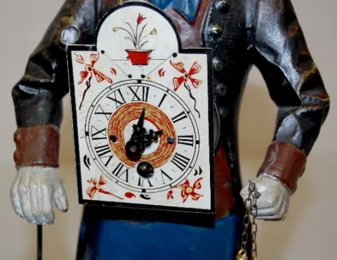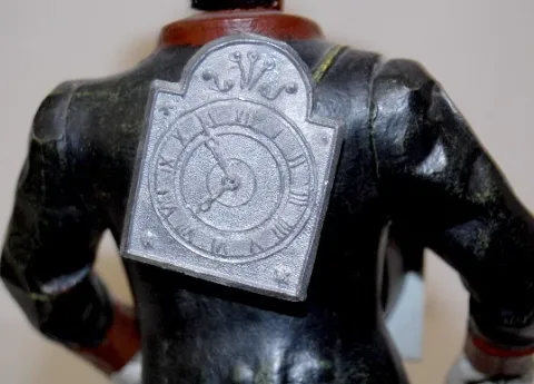 metal enamel dial; TO; gentleman in period clothing with clock and pinecone pendulums and clock on his back. Not tested. 15"