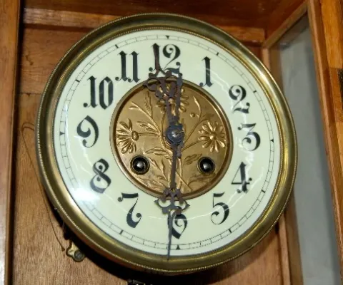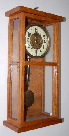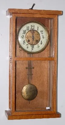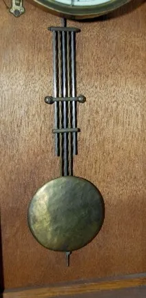 has pendulum; porcelain dial with floral embossed center; Trade symbol "Noris". (Door latch missing.) Not tested. 23 1/2"...