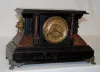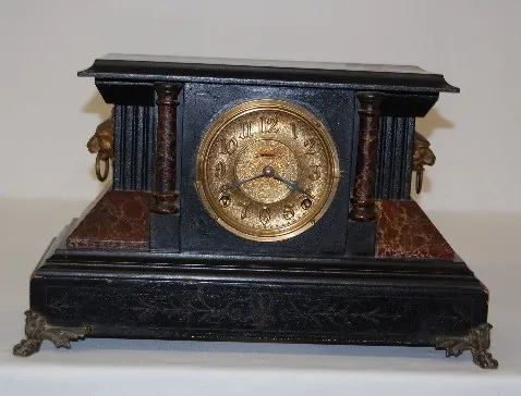 Red Marble and Black Wood Mantel Clock T & S; embossed gold metal dial; red faux marble and pillars in an enameled wood case; 3-toed feet and lions heads; maker unknown. Not tested. (No pendulum; no bezel.) 10 1/4"