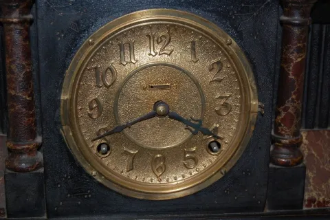 T & S; embossed gold metal dial; red faux marble and pillars in an enameled wood case; 3-toed feet and lions heads; maker unknown. Not tested. (No pendulum; no bezel.) 10 1/4"