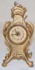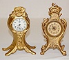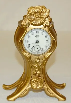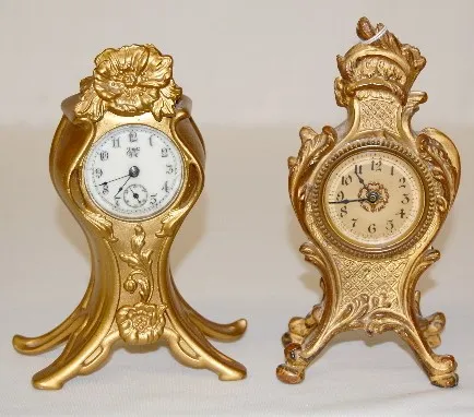 2 Metal Novelty Clocks, Waterbury & Western 1.) Waterbury, floral case; 2" dial; 6 1/2". 2.) Western, leaf case; 2" dial; 7 1/4". (Worn paint and missing winding key.)