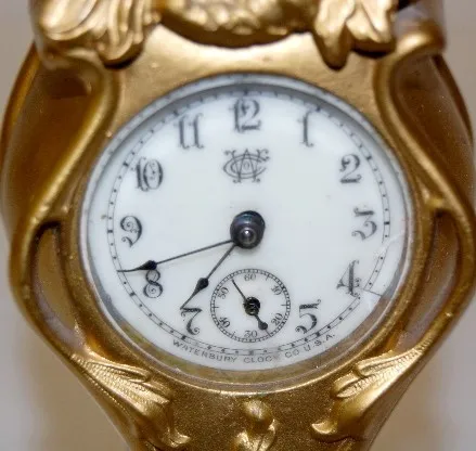 1.) Waterbury, floral case; 2" dial; 6 1/2". 2.) Western, leaf case; 2" dial; 7 1/4". (Worn paint and missing winding key.)