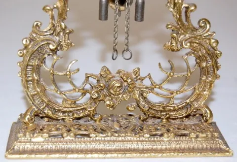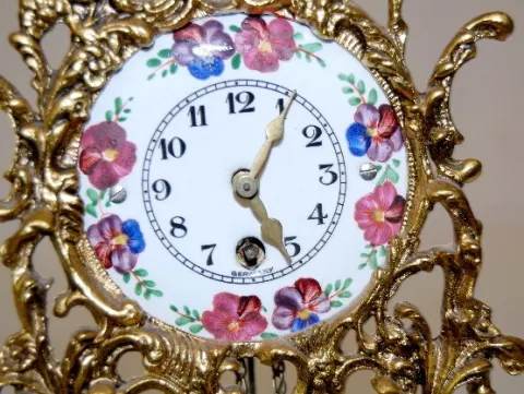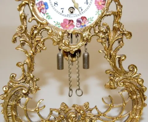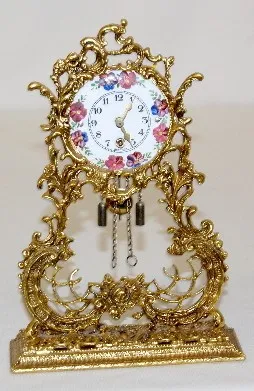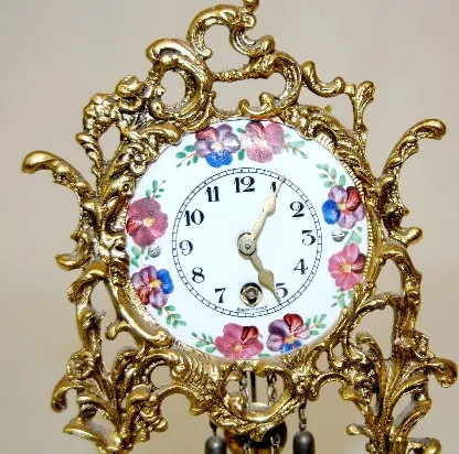 has pendulum and 2 weights; enamel decorated porcelain dial; floral filigree case. Not tested. 7 1/2"...