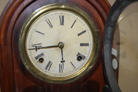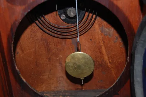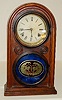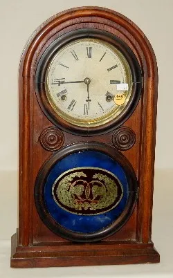 Mahogany Round Top Shelf Clock T & S; 1/2 hour gong; unmarked paper dial; has pendulum; nice case; lower door decorated with gilt lions and leaves on a red center medallion with blue around it; maker unknown. Running. 18"