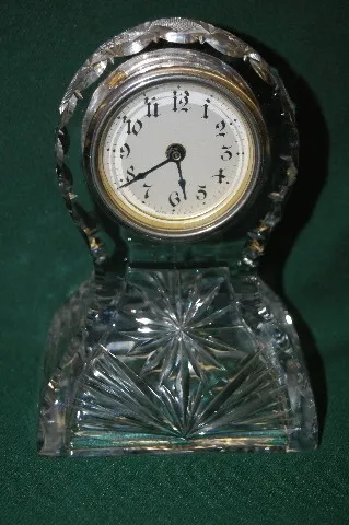 2 Pressed Glass Novelty Dresser Clocks 1.) Made in U.S.A. on painted metal dial; Made in USA on fixed key movement; floral design to case; running at this time. 2.) Unmarked porcelain dial; Made in U.S.A. on fixed key movement; frosted floral design on case; running at this time. Both 5 3/4"