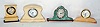 1.) Wilcox, metal marked dial; green and gold plastic case; marked Wilcox on the bottom; running at this time. 2.) Made in U.S.A.; marked paper dial; ivory colored celluloid case; running at this time. (Dial and case edge are stained.) 3.) Made in Germany; marked metal dial with seconds bit; in an ivory colored celluloid case. (Not running; seconds hand is missing.) 4.) New Haven "Intermittent"; marked porcelain dial with alarm bit; ivory colored celluloid case. (Not running.) Tallest 4 1/2"