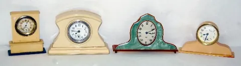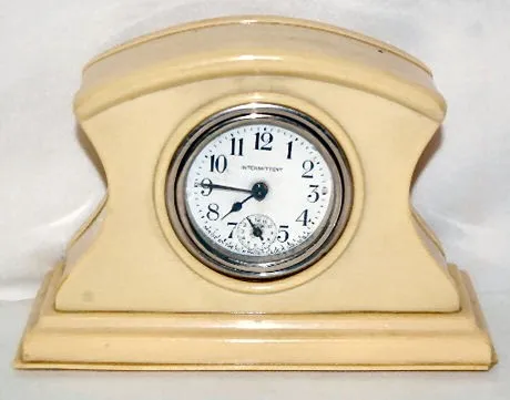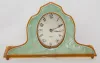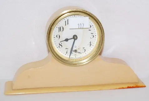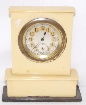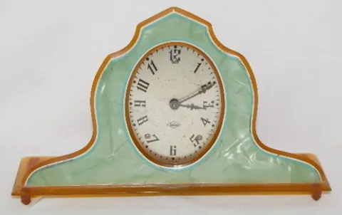 4 Celluloid and Plastic Dresser Clocks 1.) Wilcox, metal marked dial; green and gold plastic case; marked Wilcox on the bottom; running at this time. 2.) Made in U.S.A.; marked paper dial; ivory colored celluloid case; running at this time. (Dial and case edge are stained.) 3.) Made in Germany; marked metal dial with seconds bit; in an ivory colored celluloid case. (Not running; seconds hand is missing.) 4.) New Haven "Intermittent"; marked porcelain dial with alarm bit; ivory colored celluloid case. (Not running.) Tallest 4 1/2"
