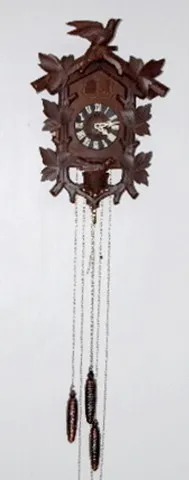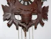 the case is carved with a bird in a nest and grape leaves; the crest is an open winged bird with a small glass eye; double door cuckoo; center dial stamped Made in Germany; tin dial with plastic Roman numerals and hands. Brass movement marked Hubertherr, Triberg, Germany, Unadjusted and No Jewels. 3 pine cone weights. Not tested. 19" includes pendulum.
