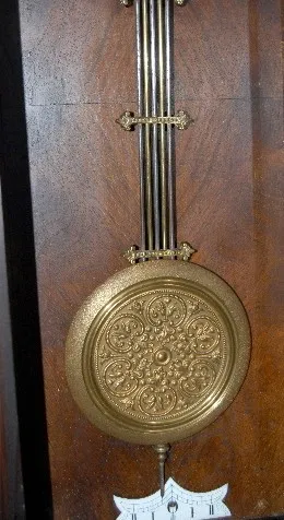 embossed pendulum; porcelain dial; T & S. (Case has worm holes.) Not tested. 31"...