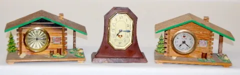 1.) Kaiser German Mountain Cabin Clock; marked metal dial; running at this time. 2.) Forestville West Germany Cabin Clock; marked metal dial; running at this time. 3.) Made in U.S.A. veneer heart clock; marked metal dial with heart cutout; beveled glass. (Not running.) Tallest 5 1/2"