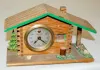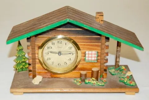 2 German Cottage and U.S.A. Mantel Clocks 1.) Kaiser German Mountain Cabin Clock; marked metal dial; running at this time. 2.) Forestville West Germany Cabin Clock; marked metal dial; running at this time. 3.) Made in U.S.A. veneer heart clock; marked metal dial with heart cutout; beveled glass. (Not running.) Tallest 5 1/2"