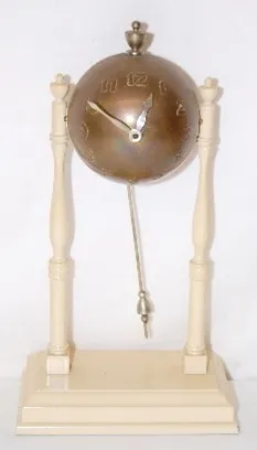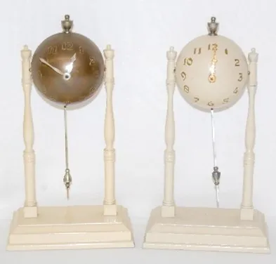 2 Metal Baseball Novelty Clocks 1.) Cream colored; not marked; raised gold numerals. 2.) Gold and cream colored; not marked; raised numbers. Neither tested. 9 3/4"