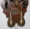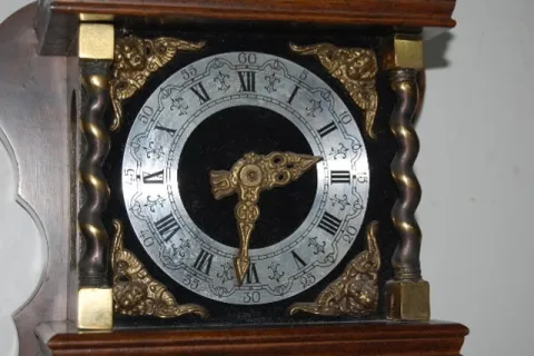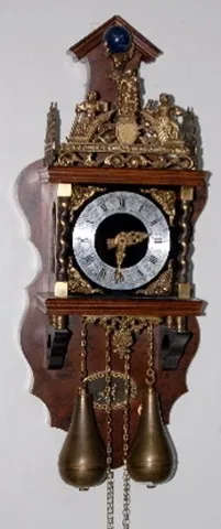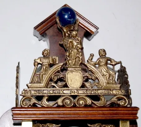 unmarked silver metal dial; metal figural Atlas with world on his shoulders and figural trim with the words "NU Elck OD Syn Sin"; man on a horse pendu...