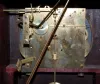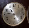 has pendulum; gold metal dial marked "Made in Germany"; 3 key holes; brass movement marked Kienzle with wings, Pat. Ang. No. 49549. (Wound tight; back door panel is coming out; material is frayed; scratches to dial; slight case wear.) 15 3/4"