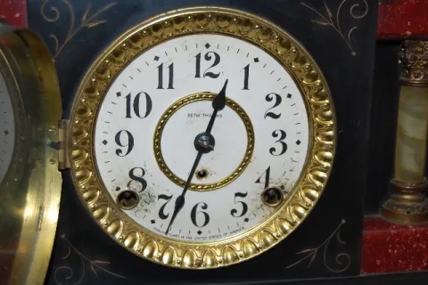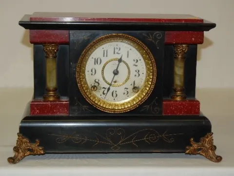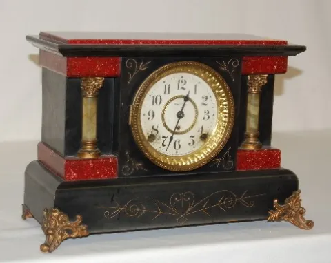 marked Seth Thomas paper dial; has pendulum and key; marked S.T. brass movement; T and 1/2 hour gong strike; red adamantine and black enamel case with...