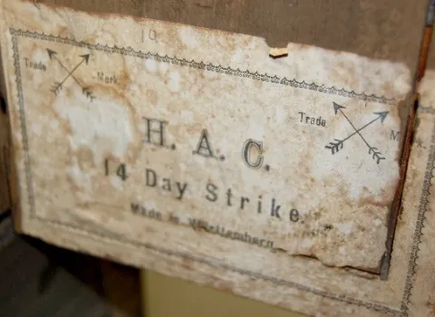 porcelain chapter ring with plain center; T & S; 14 day strike; has pendulum and key; brass movement marked with crossed arrows; paper label inside ba...