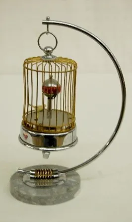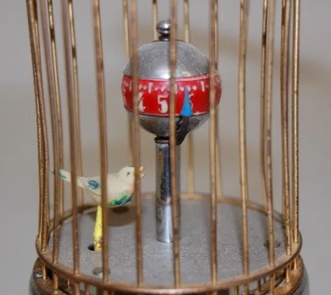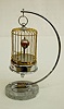 unmarked; chrome base; plastic bird; gilded cage; rotary dial; chrome and marble hanger. (Rotary dial needs put back together, it has slipped apart.) Bird is moving. 8 1/2"