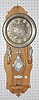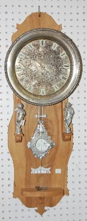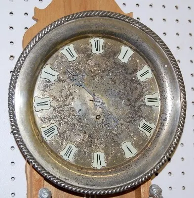 Antique RA Wall Clock, Silver Dial and Cherubs engraved 11" silver plate TO dial; with an ornate RA pendulum; winged cherub figures; old mounted on a new board; open swinger type. 31"