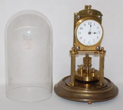 Baden Disk Pendulum Dome Clock painted metal dial; rotating disk pendulum; dial marked Baden; works not marked; metal base. Running. (Minute nicks to dome rim.) 9" Tall.