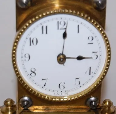 painted metal dial; rotating disk pendulum; dial marked Baden; works not marked; metal base. Running. (Minute nicks to dome rim.) 9" Tall.