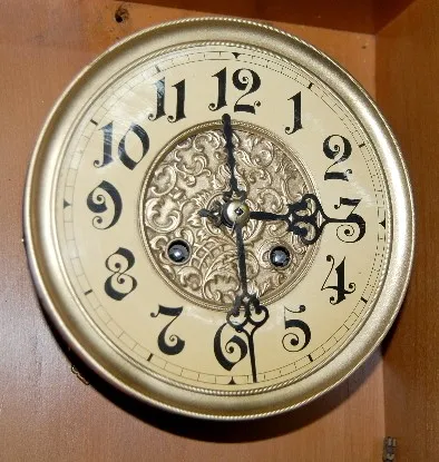 has pendulum; T & S; paper dial ring with embossed metal center. Not tested. 35"...