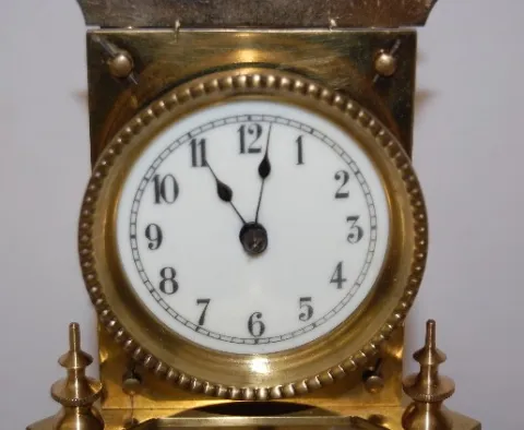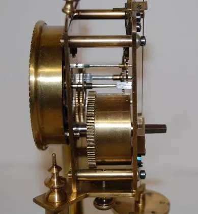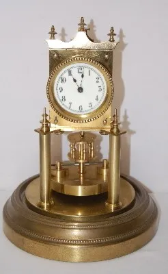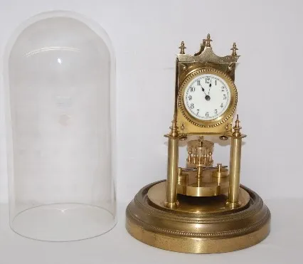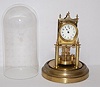 Disk Pendulum Anniversary Dome Clock porcelain dial; rotating disk pendulum; works numbered 4037. Running. (Minute chips to rim of dome.) 12" Tall.
