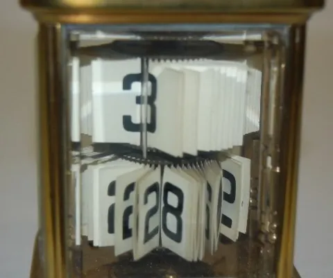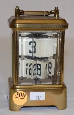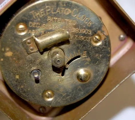 Plato Brass and Glass Perpetual Clock in a carriage clock case; marked on the bottom; 4 beveled glass panels. (Not running.) 4 3/4"