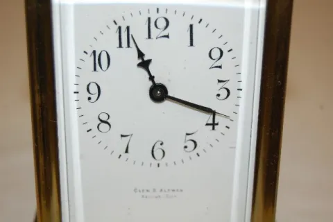 French Brass Carriage Clock porcelain dial marked "Clem. B. Altman, Kansas City"; movement marked Made in France; 5 beveled glass panels. (Not running.) 4 1/2"