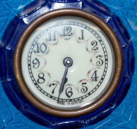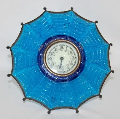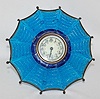 Made in Germany with a floral decorated porcelain dial; key wind movement; beveled glass; blue glass formed as a 12 spoke open umbrella with the handl...
