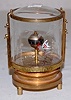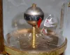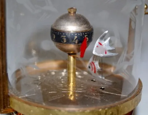 metal key wind case with cut fish decorated glass dome; 2 white angel fish and a rotary dial. (No loop top handle.) Not running. 5 1/4"
