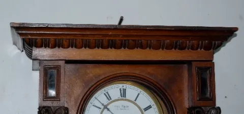 2 Wt Carved (Remember) Vienna Regulator Clock carved case; signed Remember on movement; dial signed Franz Maier; 2 weights and pendulum. (Missing top of clock; minor crack in dial; slight case wear..) Not tested. 37"
