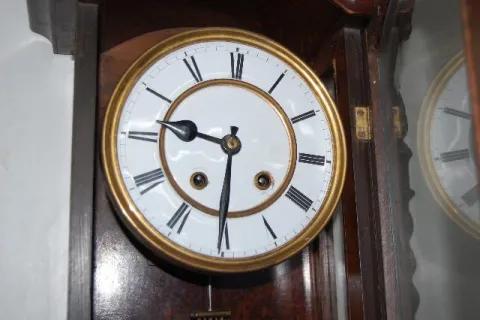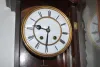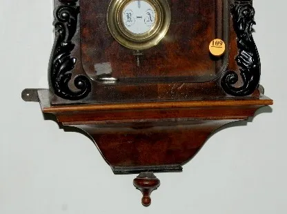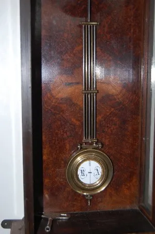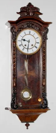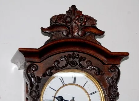 signed movement 189131; porcelain dial; RA pendulum with key; case has fancy carvings on the door and floral carvings on the top. Not tested. 33 1/2"