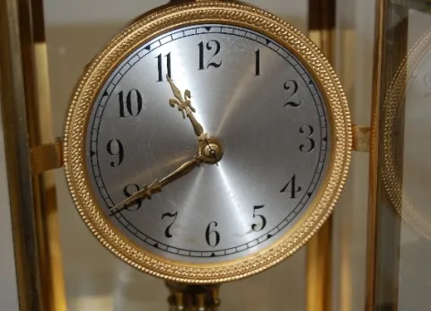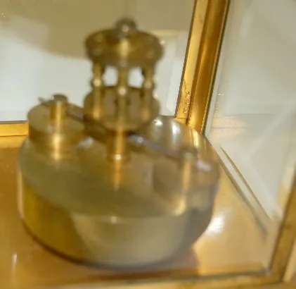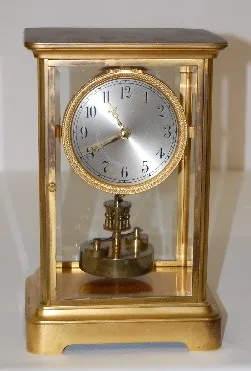 silver metal dial; rotating disk pendulum; works marked Germany No. 96330; gilded brass frame; plate glass door and sides. Running. (Finish wear to ca...